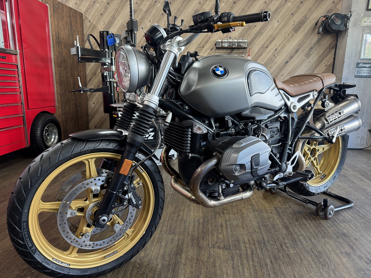 BMWのRnineTの派生モデル スクランブラーに、ミシュランのロード系アドベンチャータイヤ アナキーロードを取り付けさせて頂きました!こちらのRnineTは国内50台限定モデル…