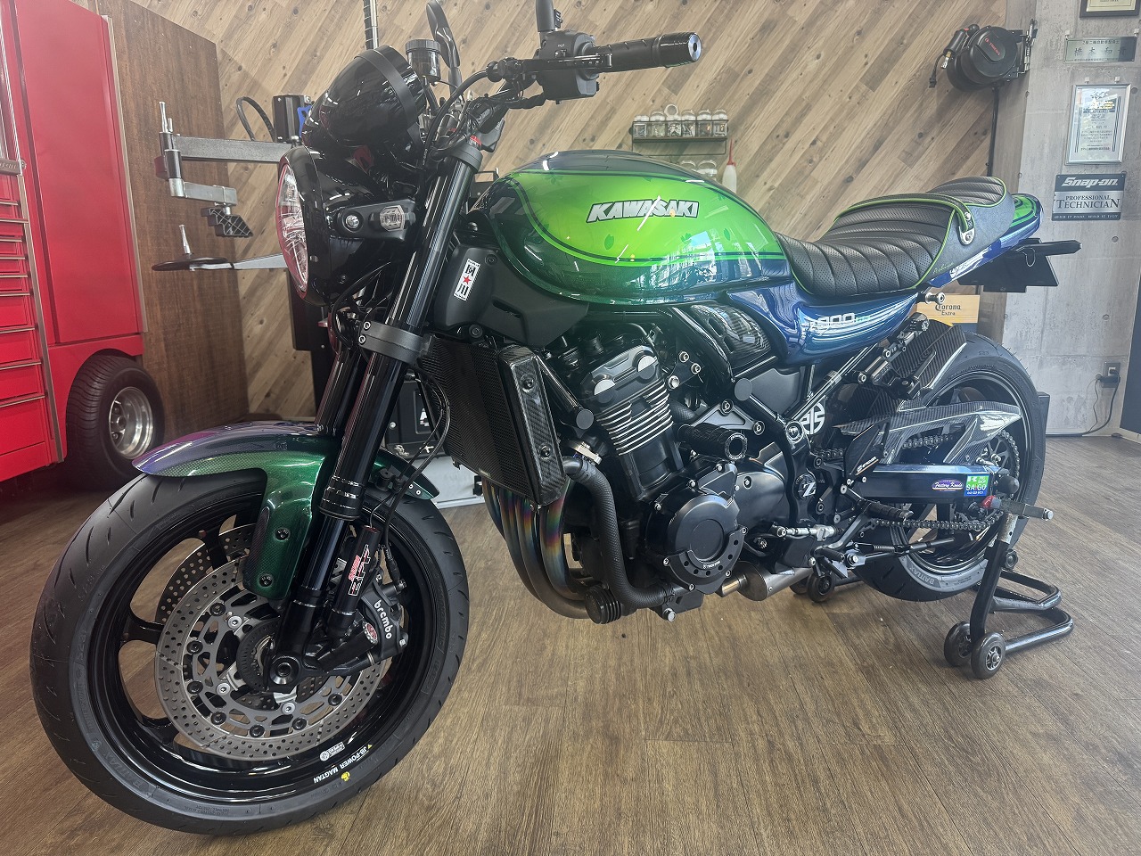 カワサキの人気のネイキッドモデルZ900RSに、ブリヂストンのスポーツタイヤS23を取り付けさせて頂きました!マグネシウムホイール、前後サスペンション、ブレーキ周りなど…